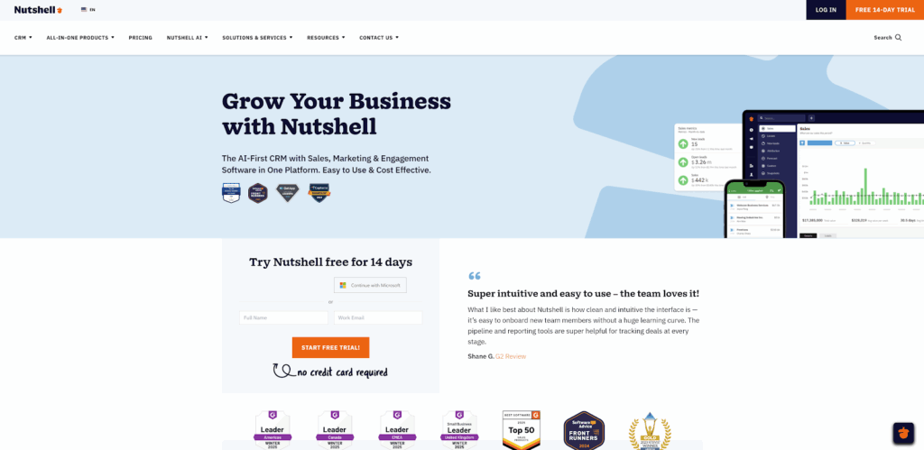 Nutshell is an accessible CRM designed for sales teams that want to close more deals without unnecessary complexity. It offers sales automation, customizable pipeline management, reporting and analytics, email automation, AI-powered tools, and team collaboration features. Thanks to Nutshell’s exceptional ease of use, your team can start closing deals on day one without extensive training.